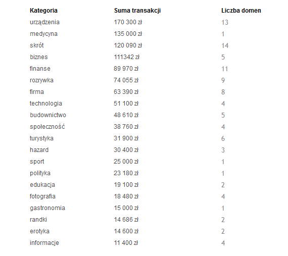 Po zestawieniu widać, że w 2012 roku w Polsce najlepiej sprzedawały się nazwy domen zawierających nazwy urządzeń czy narzędzi (np. telefony.pl, spawarki.pl, helikoptery.pl). Jeżeli domena na sprzedaż odnosiłaby się do urządzeń to można byłoby wycenić ją wyżej niż np. domenę związaną z edukacją.