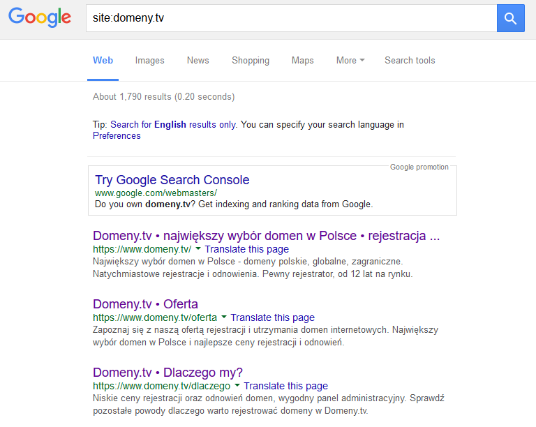 Najprostszą metodą będzie sprawdzenie, czy strona znajduje się w indeksie wyszukiwarki. W wyszukiwarce Google służy do tego operator „site:”, który pokazuje ile i jakie podstrony Google posiada w swoim indeksie. Aby sprawdzić np. czy serwis www.domeny.tv jest w indeksie, należy wprowadzić w Google zapytanie: site:domeny.tv. Jeżeli w wyniku powyższego zapytania otrzymamy naszą stronę oraz pozostałe podstrony, oznacza to, że serwis nie został zbanowany w wyszukiwarce.
