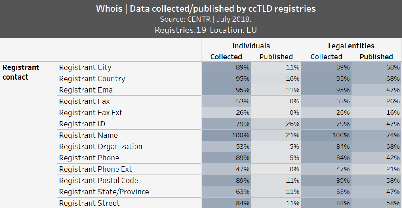 Okazuje się więc, że rejestry ujawniły w bazie WHOIS 11% adresów e-mail należących do osób fizycznych oraz 47% należących do przedsiębiorstw (przy wskaźniku zebranych danych wynoszącym 95% w obu przypadkach). Jeśli chodzi o imię i nazwisko rejestrującego, zostały ujawnione w przypadku 21% osób prywatnych oraz 74% przedsiębiorstw. Numer telefonu został ujawniony u 5% osób prywatnych i 42% firm. Więcej informacji o danych upublicznionych w bazie WHOIS znajdziemy w tabelce poniżej.