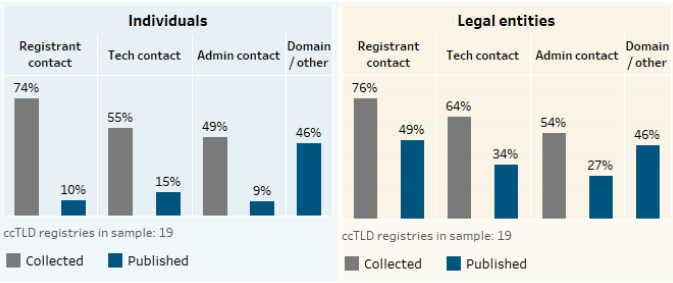 Jeśli chodzi o dane kontaktowe rejestrujących, to w przypadku osób prywatnych wskaźnik zebranych danych wyniósł 74%, a w bazie WHOIS upubliczniono 10% z nich. Co do danych kontaktowych firm, z zebranych 76%, upubliczniono 49%.