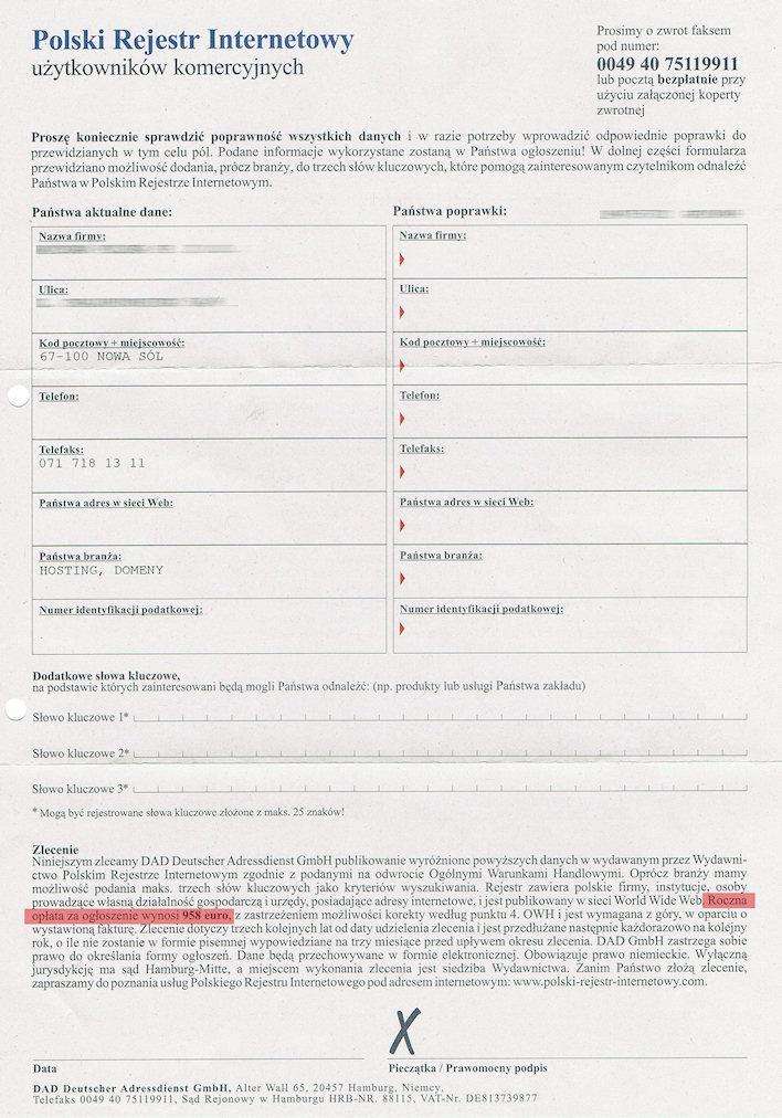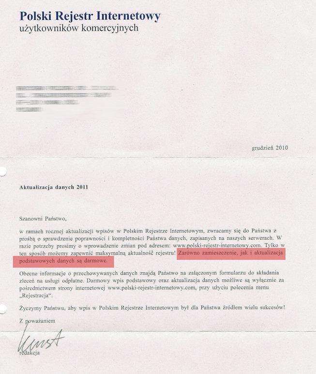 Ten temat przewija się przez polskie media elektroniczne i nie tylko też od dłuższego czasu. Warto więc napisać o nim jeszcze raz. Pewna niemiecka firma wysyła masowo listy do polskich firm z propozycją dokonania wpisu do prowadzonego przez nich katalogu internetowego, o dumnie brzmiącej nazwie "Polski Rejestr Internetowy". Pismo przewodnie wygląda ładnie i zachęca do dalszej lektury.