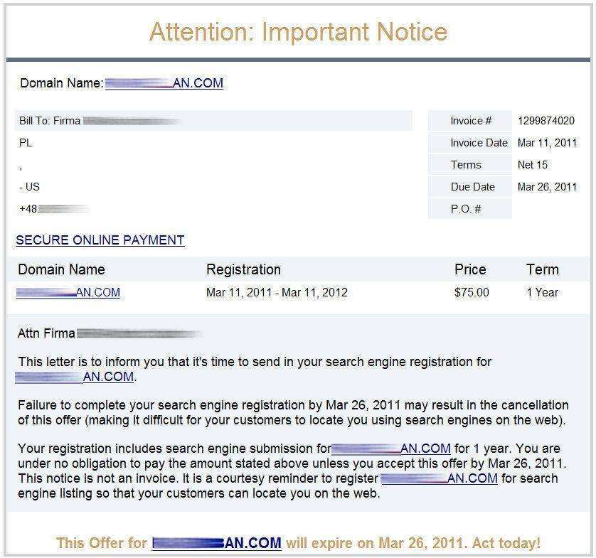 Takie powiadomienia otrzymujemy bardzo często, szczególnie jeśli mamy dużo domen. Warto jednak sprawdzić dokładnie, kto nam o tym przypomina. Możemy otrzymać po prostu ofertę na przedłużenie ważności domeny od zupełnie innej firmy, niż nasz aktualny rejestrator. List często zaczyna się serią ostrzeżeń o możliwych konsekwencjach zignorowania konieczności szybkiego przedłużenia domeny. Odbiorca listu jest więc "zmotywowany" do jak najszybszego dokonania płatności.