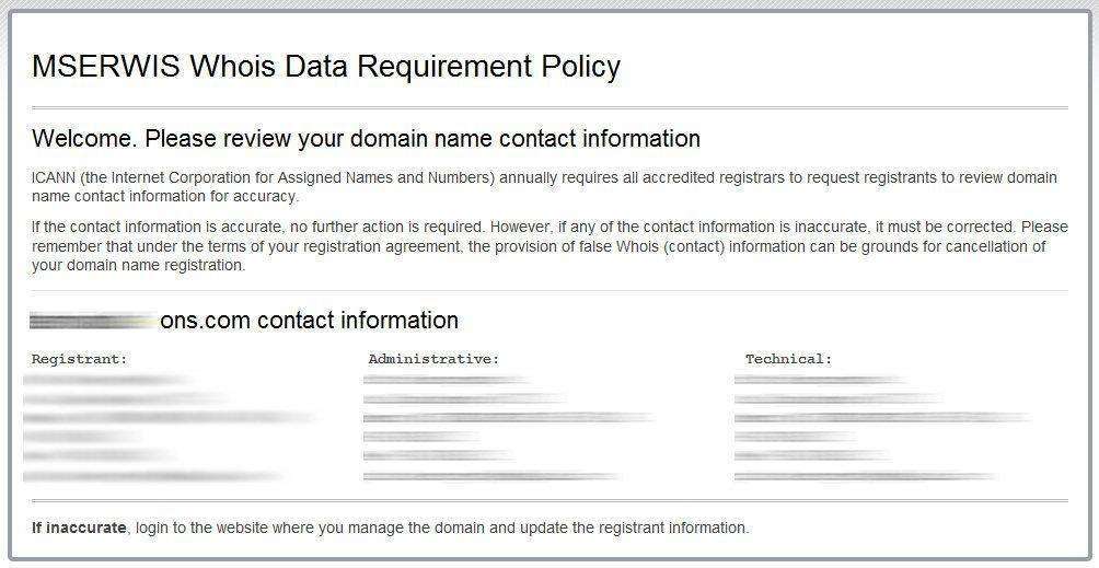 Zwróć uwagę, że w powiadomieniu nie ma żadnego wezwania do podania nowych danych na tej stronie, a jedynie prośba, iż jeśli dane są nieaktualne, należy się zalogować do systemu swojego rejestratora - fragment "If inaccurate, login to the website where you manage the domain and update the registrant information."