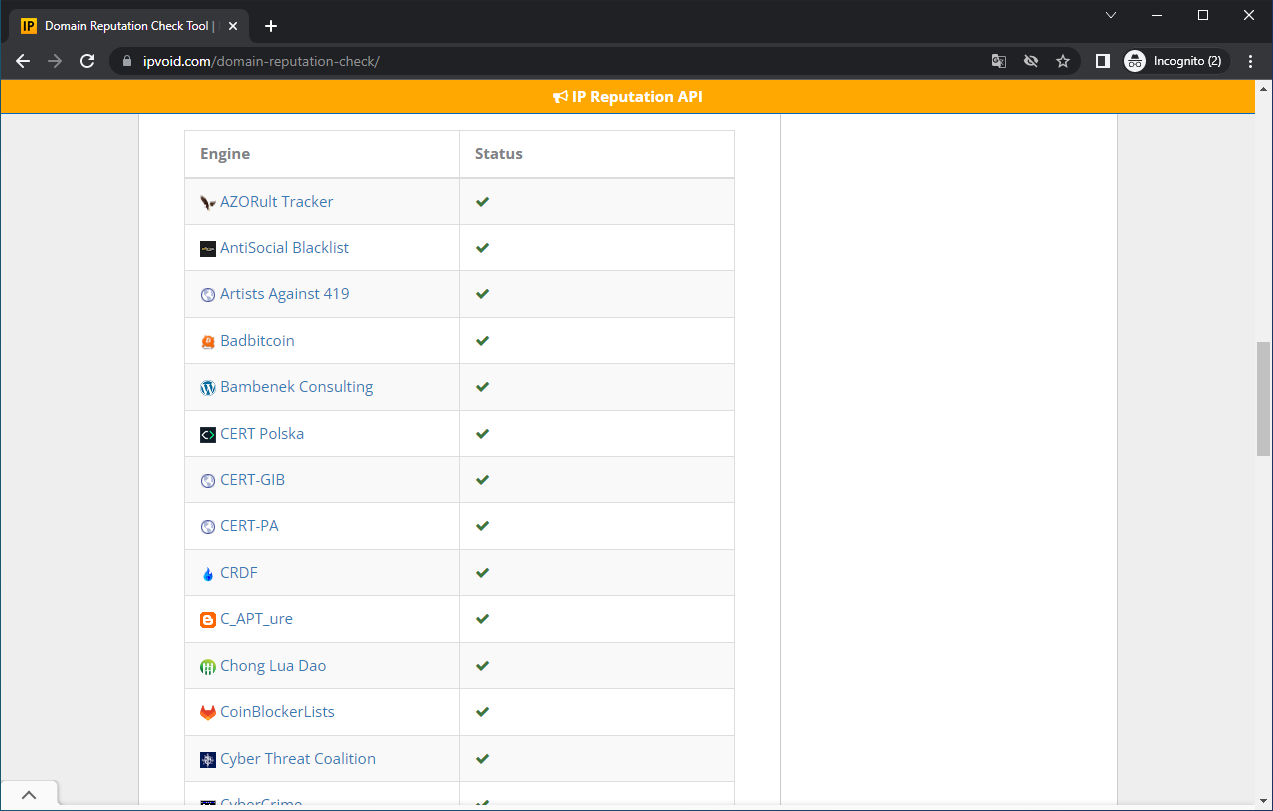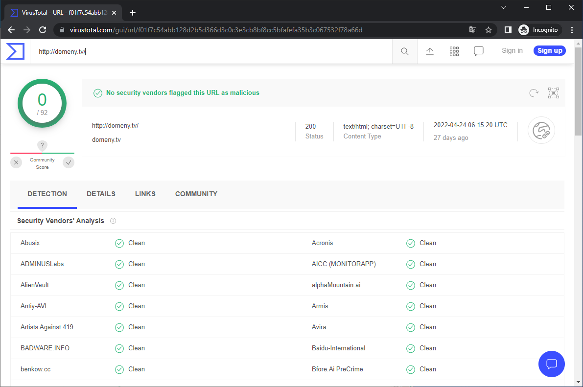 Wyniki skanowania list reputacyjnych pokazuje Rysunek 1. Częścią wyniku jest ocena społeczności, która powinna być oceną pozytywną lub neutralną.