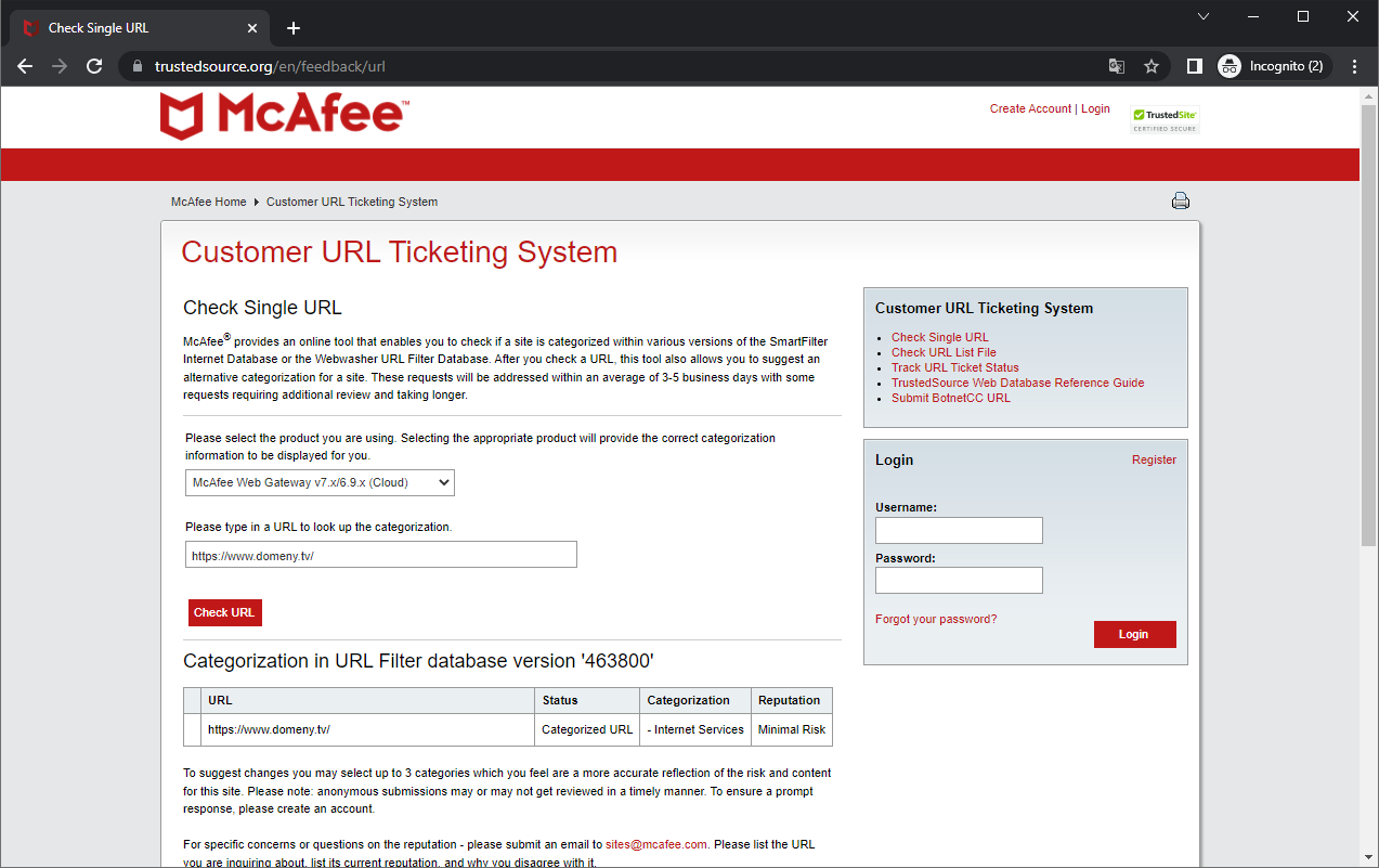 W serwisie https://www.trustedsource.org/ firmy McAfee, sprawdzamy darmowo i bez logowania reputację dowolnej domeny, adresu IP, lub linku. Musimy tylko wybrać z listy bazę danych narzędzia z którego chcemy skorzystać np. McAfee Webgateway Cloud. Jako wynik otrzymujemy ocenę reputacji domeny - Rysunek 6.