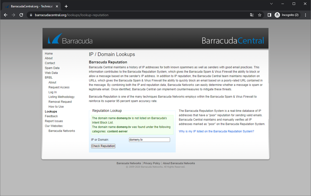 Barracuda Reputation System, sprawdza reputację adresów IP i domen. Wchodzimy na stronę: