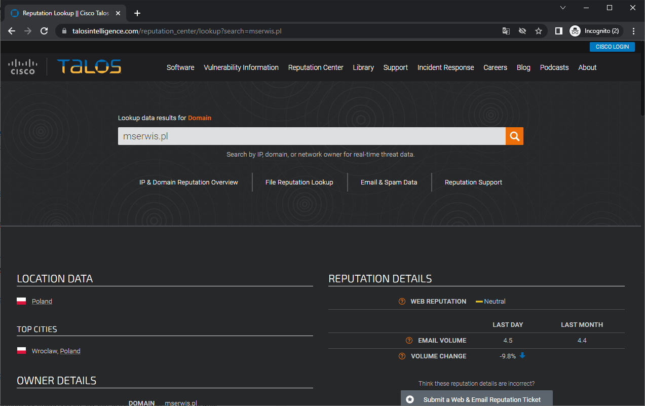 Kolejny serwis do sprawdzania reputacji domeny lub adresu sieciowego IP, jest dostarczany przez światowego lidera technologii sieciowych Cisco Systems ze Stanów Zjednoczonych. Możemy zweryfikować reputację zarówno adresu IP serwera poczty e-mail, jak i domeny.