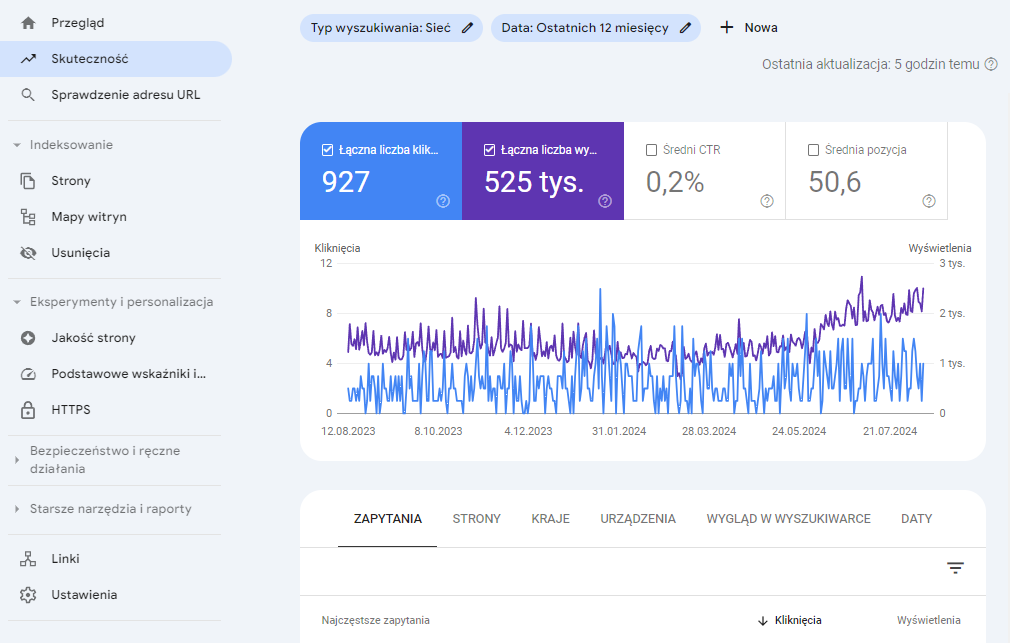 Google Search Console (GSC) pozwala na monitorowanie ruchu na Twojej stronie internetowej. Dzięki narzędziu możesz przeglądać wyszukiwane zapytania w Google, które doprowadziły użytkowników do Twojej witryny. Jeśli zauważysz, że użytkownicy regularnie trafiają na Twoją stronę poprzez błędnie wpisane słowo kluczowe, może to być dobry sygnał do rejestracji domeny z tą literówką. Jednakże GSC skupia się głównie na zapytaniach dotyczących nazw i nieuwzględniania rozszerzeń domenowych, co częściowo ogranicza możliwości analizy literówek na poziomie całych adresów URL.