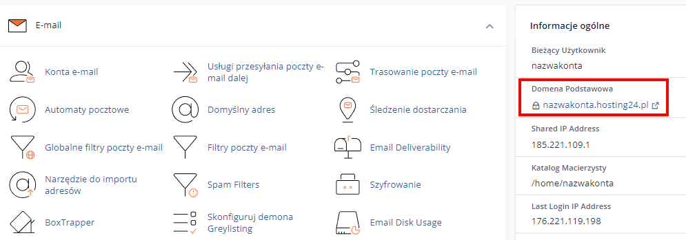 Informacje o swojej domenie technicznej znajdziesz po zalogowaniu się do swojego konta cPanel pod opcjami: