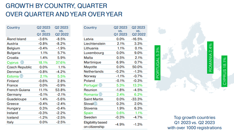 Największy wzrost rejestracji w odniesieniu do poprzedniego kwartału odnotowano na Cyprze (18,1%), co uczyniło go krajem o największym wzroście w tym okresie. Kolejne miejsca zajęły Portugalia (5,3%) oraz Rumunia (2,4%). W porównaniu do zeszłorocznego drugiego kwartału największy wzrost rejestracji również przypada Cyprowi - o aż 37,6%. Ponownie za nim są: Portugalia (13,3%) oraz Rumunia (6%).