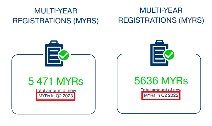 Rejestracje wieloletnie domeny .eu (z ang. multi year registrations - MYRs) to takie, które są dokonywane na okres dłuższy niż rok. W drugim kwartale 2023 roku EURid odnotował ich 5 471, czyli o 2,9% mniej (156 domen) w zestawieniu do poprzedniego roku.