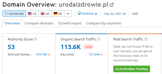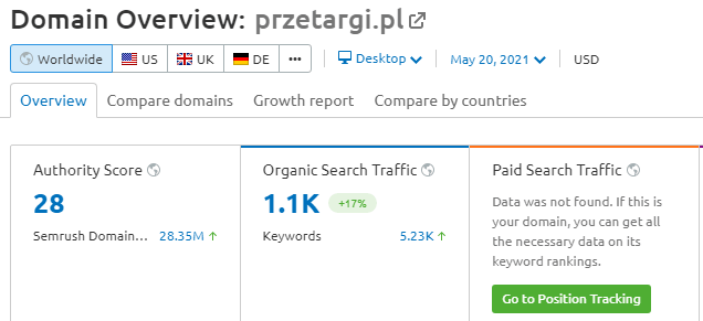 Ciężko samodzielnie zweryfikować autentyczność wskaźników dostępnych na giełdowych stronach, pokazujących żywotność domeny, np. ruch na domenie. Dzieje się tak dlatego, ponieważ Ty jako odbiorca nie posiadasz dostępu do wewnętrznych statystyk domeny. Dostajesz wyłącznie to, co napisze na swojej stronie dany serwis czy giełda. Takie statystyki nie zawsze muszą pokrywać się z rzeczywistością. Można je częściowo zweryfikować np. przy użyciu testowej wersji narzędzia SEMrush, czyli zaawansowanego narzędzia do przeprowadzania audytu SEO strony.