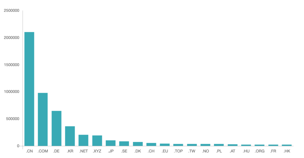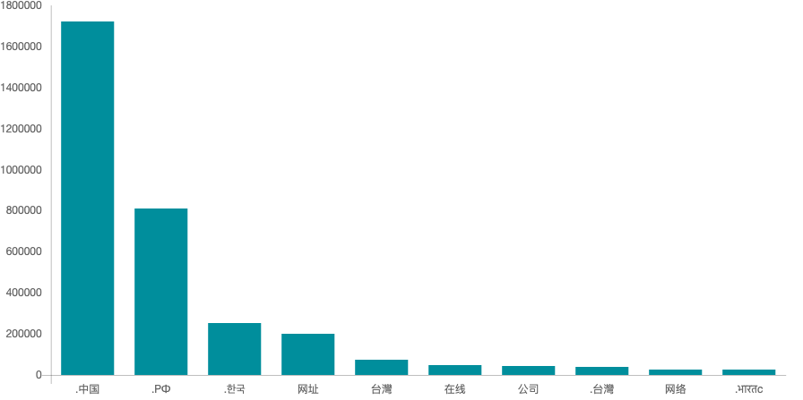 Poniżej przedstawione są dwa wykresy przedstawiające ilość zarejestrowanych domen w konkretnych rozszerzeniach. Niewątpliwie największym zainteresowaniem cieszą się domeny chińskie, com oraz rozszerzenia rosyjskie.