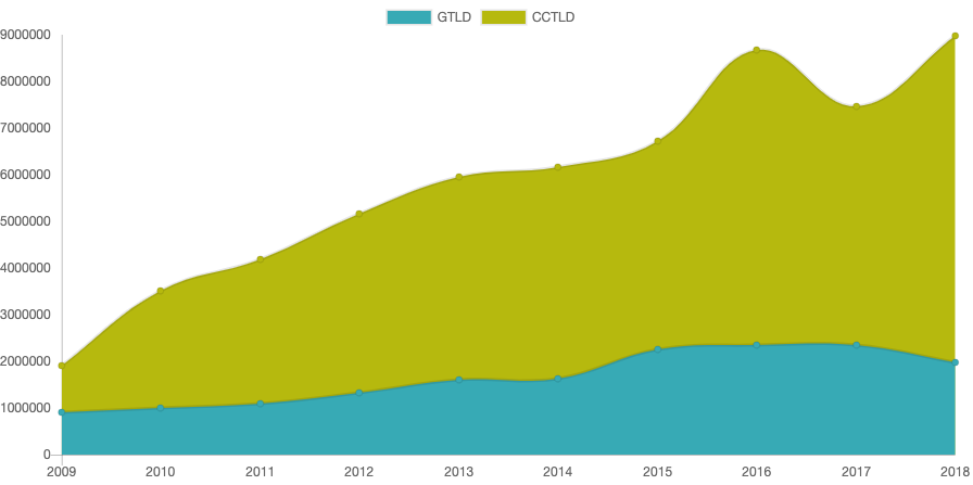 Pod koniec 2018 roku istniało 7 milionów domen ccTLD i 2 miliony domen gTLD.