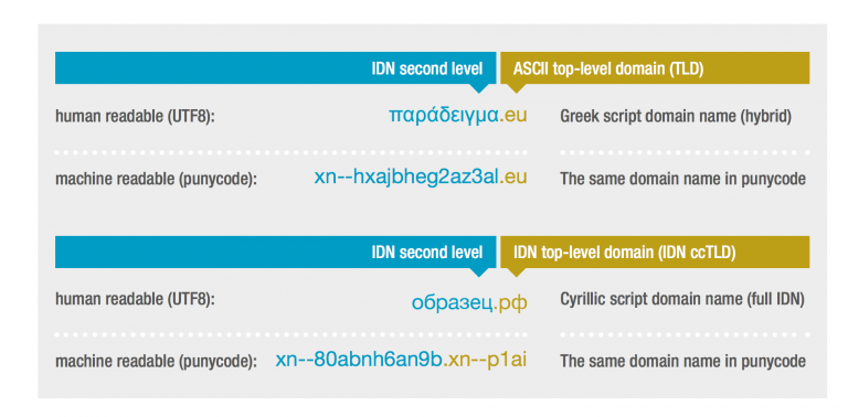 - Formy technicznej (wewnętrznej) odwzorowanej za pomocą specjalnego algorytmu (Punycode) do takiej postaci, aby można było ją wprowadzić w DNS. W formie technicznej (wewnętrznej) nazwa domeny składa się z alfabetu łacińskiego, ale rozpoczyna się sekwencja "xn--".