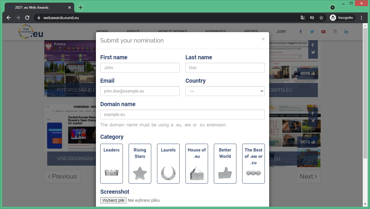 W tym roku masz czas do 5 sierpnia 2021. Wypełnij wniosek konkursowy na stronie (Rysunek 2): https://webawards.eurid.eu/