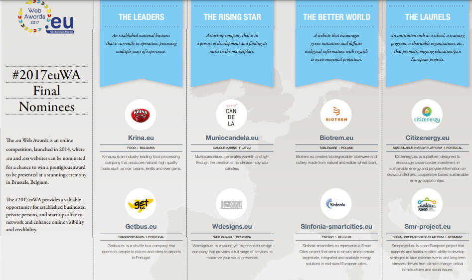 Jeżeli masz stronę w domenie .eu lub planujesz nowe przedsięwzięcie, koniecznie pomyśl o konkursie .eu WebAwards. W tym roku zostało już niewiele czasu na zgłoszenie udziału, ale pamiętaj że konkurs jest organizowany cyklicznie.
