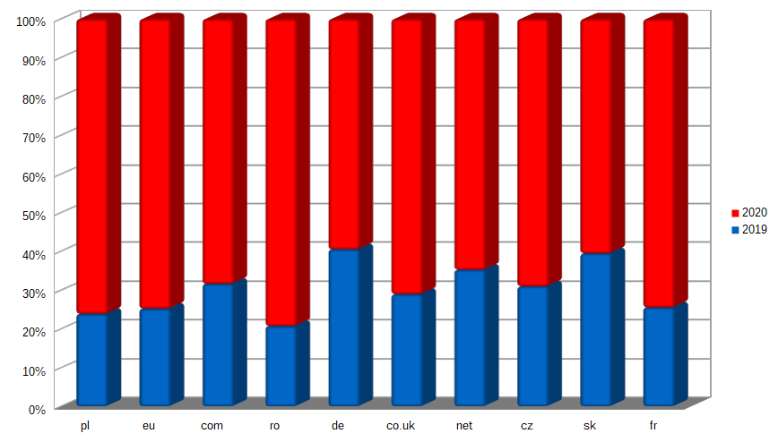 Rysunki 1 i 2 pokazują 10 najpopularniejszych rejestrowanych domen w 2020 roku oraz procentowy wzrost ilości rejestracji w stosunku do roku 2019. Możemy śmiało powiedzieć, że dzięki naszym klientom to był udany rok.