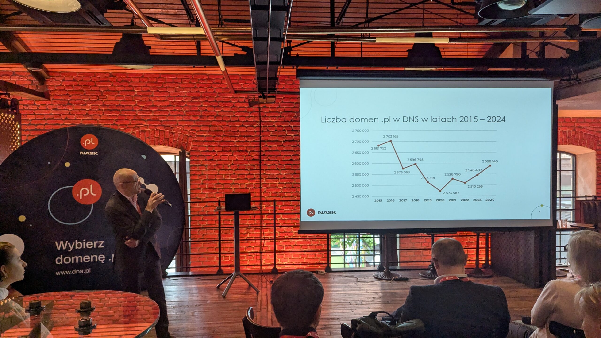 Zaraz po otwarciu konferencji Paweł T. Goławski przedstawił dane rynkowe za rok 2024. Dowiedzieliśmy się m.in., że Polska domena .pl liczyła pod koniec roku 2 588 140 aktywnych nazw, co daje Polsce 7. miejsce w Europie pod względem liczby zarejestrowanych domen narodowych. Pokazał też, jak rośnie liczba domen zabezpieczonych DNSSEC i jak zmienia się dynamika rejestracji.