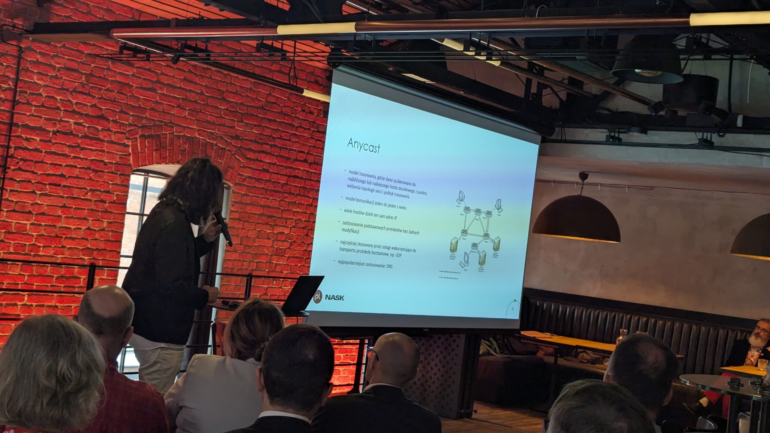 Prelegenci omówili rozwój infrastruktury DNS, skupiając się na wdrażaniu modelu anycast i rozszerzaniu zabezpieczeń DNSSEC. Anycast to technologia, która pozwala kierować zapytania DNS do najbliższego serwera w sieci, co zwiększa szybkość działania i odporność systemu na awarie oraz ataki. Wspomniano również o planowanej rozbudowie obu niezależnych sieci anycast NASK. Pokazano, jak rozbudowa tej infrastruktury i aktualizacja algorytmów DNSSEC wzmacniają bezpieczeństwo, a liczba domen .pl objętych tym zabezpieczeniem rośnie dynamicznie.
