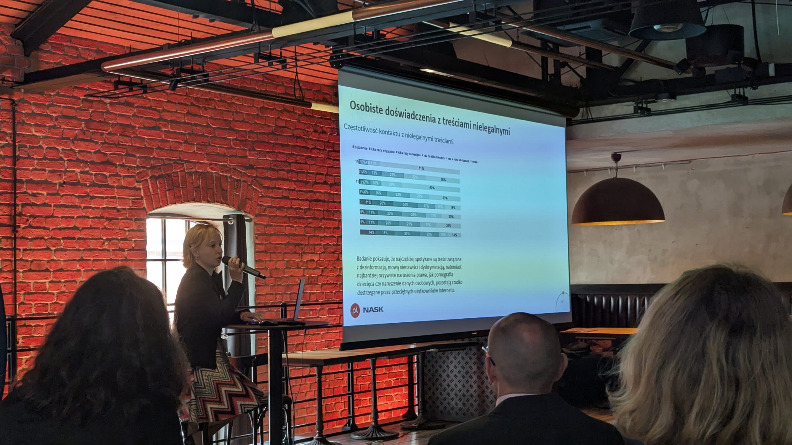 Za zakończenie dr hab. prof. KUL Urszula Soler zaprezentowała wyniki badania dotyczącego nielegalnych treści w Internecie, przeprowadzonego na próbie 1083 osób. Omówiła najczęściej spotykane rodzaje treści uznawanych za nielegalne, sposób ich odbioru przez użytkowników oraz wnioski, które NASK wyciąga na potrzeby dalszych działań edukacyjnych i legislacyjnych. Przedstawiła również znajomość i skuteczność narzędzi do walki z nielegalnymi treściami.