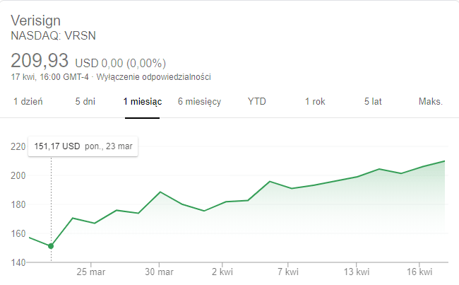 Analizując sytuację giełdową, zamrożenie ceny rejestracji i odnawiania domen mogło przyczynić się do znaczącego wzrostu cen akcji rejestru Verisign. W porównaniu do najgorszego wyniku z 23 marca - 151,17 dolara, zaraz po ogłoszeniu wstrzymania podwyżek, akcje firmy diametralnie poszybowały do góry. 20 kwietnia ich wartość wyniosła 209,93 dolara.