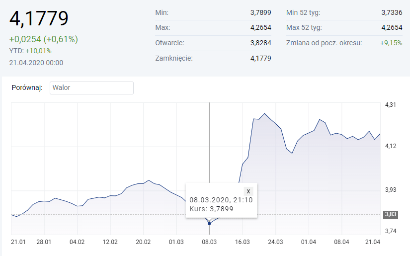 Od 08.03.2020 roku do 21.04.2020 roku wartość dolara wzrosła blisko o 40 groszy.