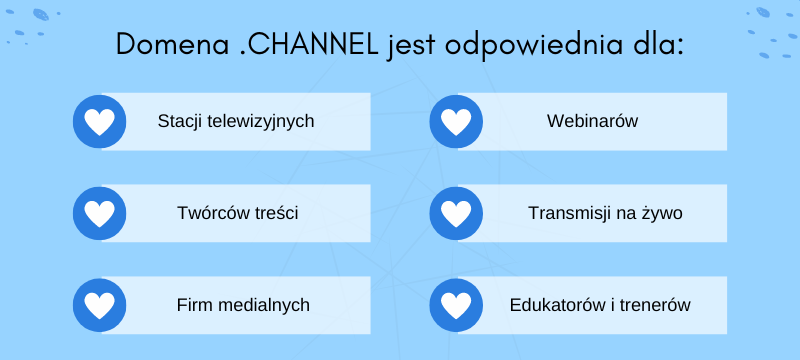 Domena .channel to świetne narzędzie dla edukatorów i trenerów prowadzących kursy wideo online, chcących zaprezentować swoje oferty. Na stronie z tym rozszerzeniem umieścisz lekcje wideo, materiały edukacyjne, testy i ćwiczenia czy platformę do komunikacji z uczniami. Taka strona zwiększy Twoją wiarygodność i przyciągnie nowych kursantów.