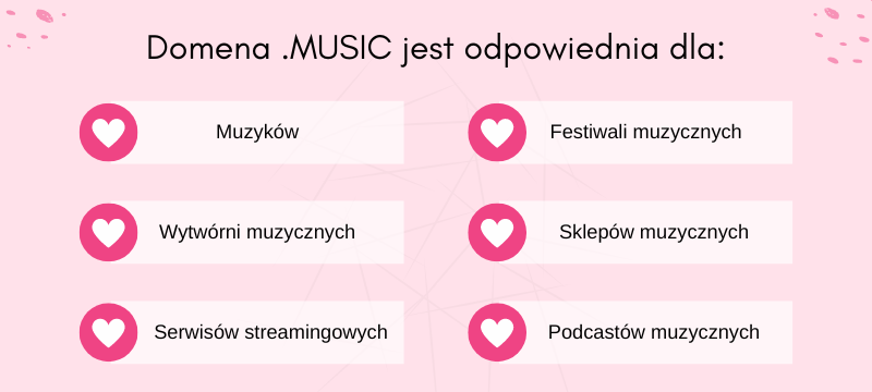 Jeśli prowadzisz bloga muzycznego, kanał na YouTube czy podcast, .music pomoże Ci zbudować markę i dotrzeć do większej liczby odbiorców. Twoi czytelnicy, widzowie czy słuchacze od razu będą wiedzieli, że znajdą u Ciebie treści związane z muzyką. To zwiększy Twoją wiarygodność i zaangażowanie odbiorców.