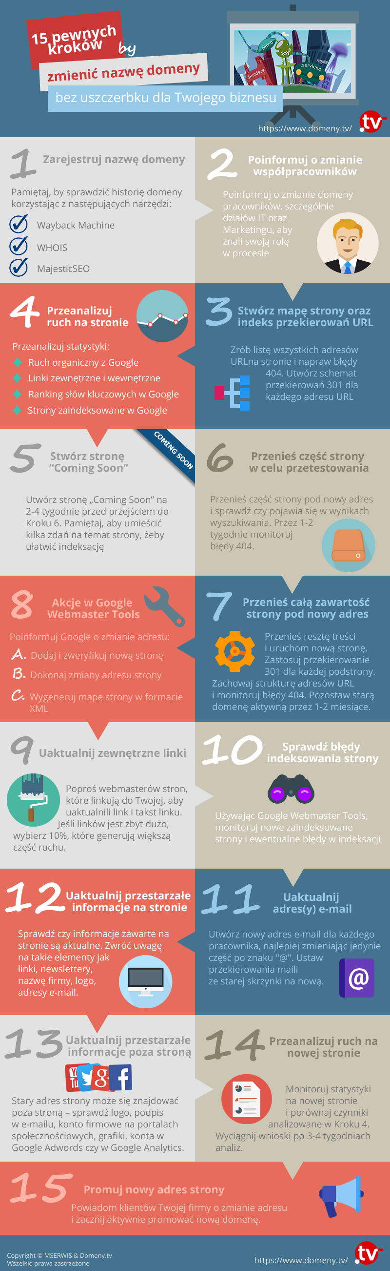 Zajrzyj tu po wyczerpującą listę wskazówek, które pozwolą poprawnie zmienić nazwę domeny. Możesz też kliknąć na grafikę obok, aby wyświetlić wskazówki w formie infografiki, którą możesz zapisać i zawsze mieć przy sobie jako przypomnienie najważniejszych informacji.