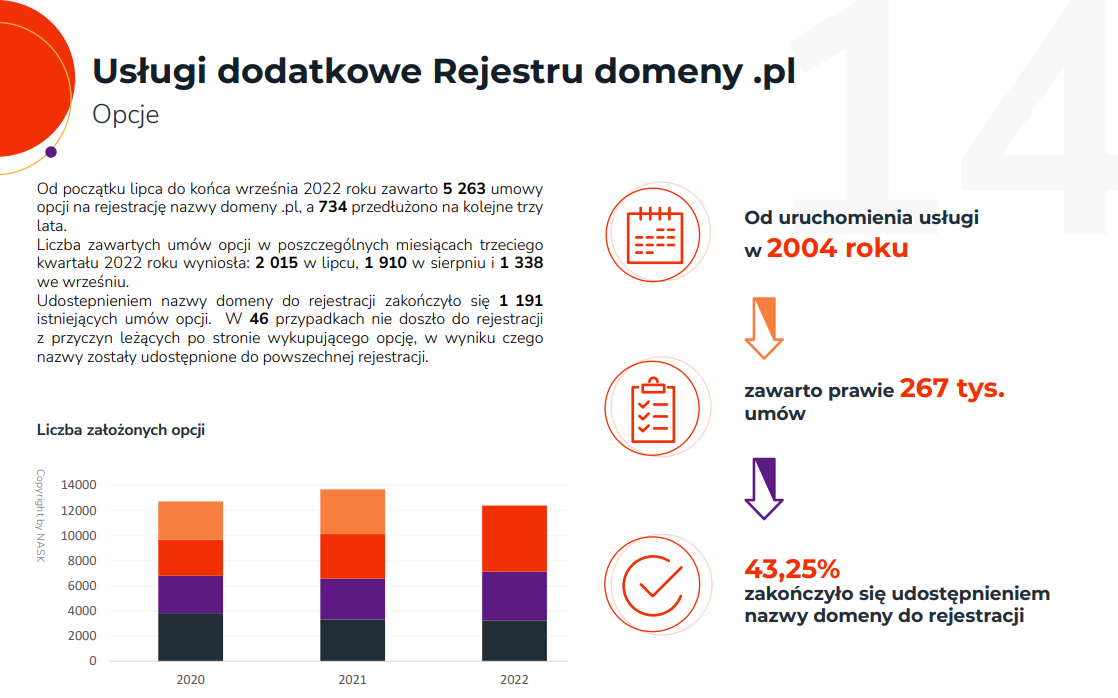 Zestawiając ze sobą kwartalne oraz roczne statystyki z raportów zauważysz tendencję malejącą na skutecznie zakończone umowy opcji na domenę .pl od momentu powstania usługi. Powodem może być zauważalne przywiązanie abonentów do swoich domen. Zaobserwujesz także, że w 2022 roku było najwięcej zleconych opcji, a to podkreśla stałe i duże zainteresowanie tą usługą.