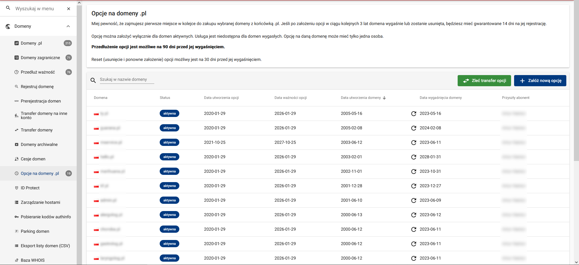 Jeśli na domenę jest założona opcja, to w opisie znajdziesz informację dotyczącą tego, kiedy została ona utworzona i kiedy wygasa.