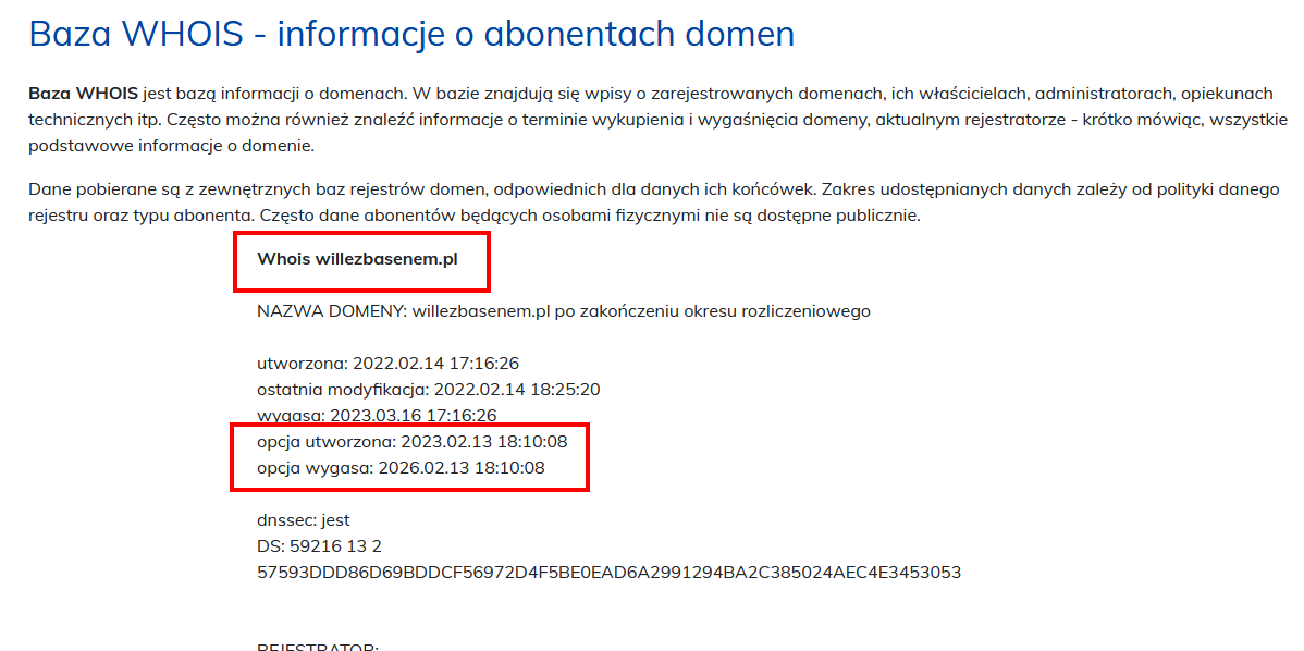 W celu sprawdzenia, czy na daną domenę jest założona Opcja, posłuż się ogólnodostępną bazą WHOIS.