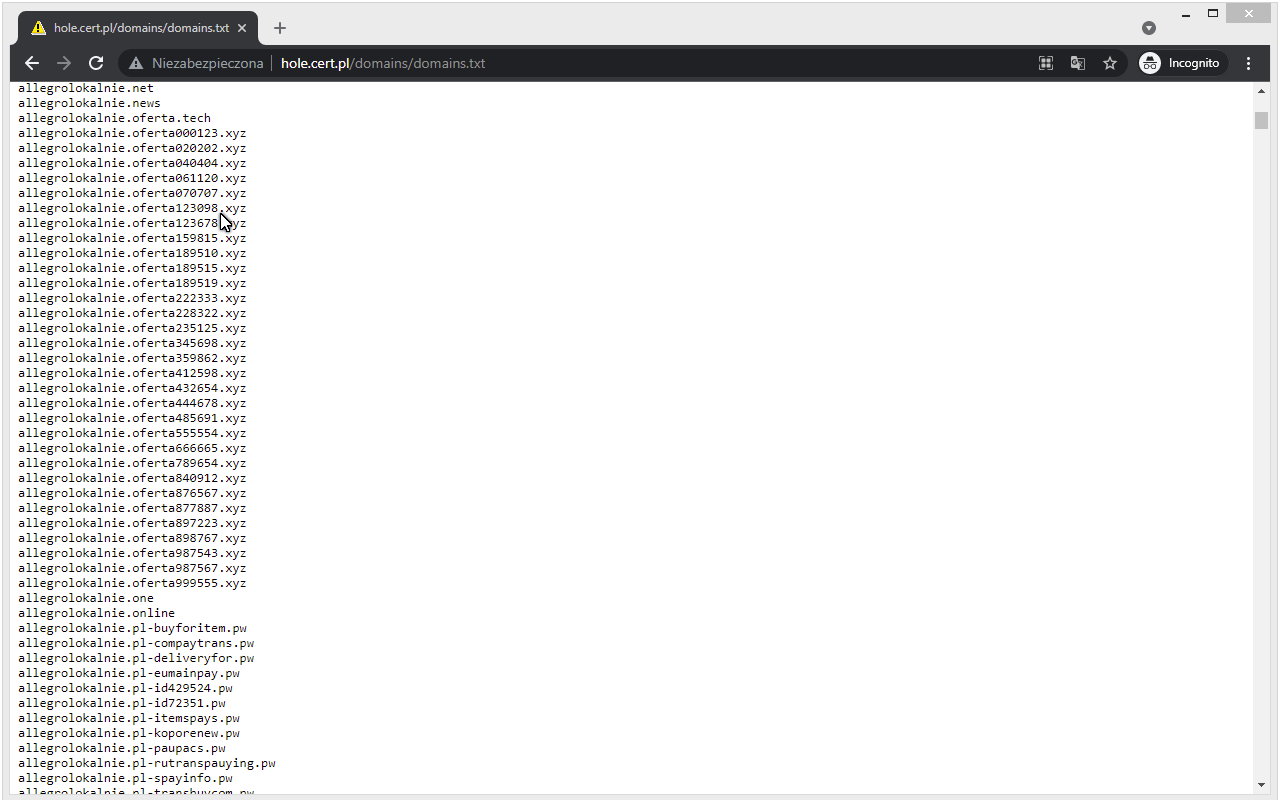 Aktualna zawartość Listy Ostrzeżeń (“złośliwych domen”) jest publicznie i nieodpłatnie dostępna pod adresem: http://hole.cert.pl/domains/. Przejrzyj tę listę i zobacz, pod jakie firmy (marki), najczęściej podszywają się przestępcy w Polsce. Na Rysunku 1 widać fragment listy z domenami podszywającymi się pod serwis Allegro.