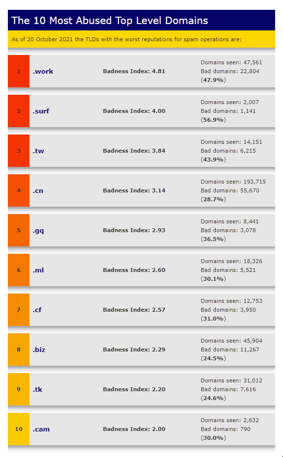Hakerzy rejestrują domeny w różnych rozszerzeniach w celu uruchomienia serwisów www ze złośliwym oprogramowaniem, które pracuje na ich korzyść. Nie ma jednoznacznych reguł przed jakimi domenami powinno się ostrzegać. Korzystając z sieci powinniśmy zwracać uwagę na link, w który chcemy kliknąć, a później np. zalogować się, zostawić nasze dane (to trochę tak jak sprawdzenie numeru konta, na który chcemy wykonać przelew bankowy). Pisząc ten artykuł znalazłem w sieci ciekawe zestawienie Spamhaus.org, dostawcy zabezpieczeń antyspamowych. Pokazuje ono jakie są najpopularniejsze rozszerzenia złośliwych domen, które używają przestępcy – spamerzy (Rysunek 11).