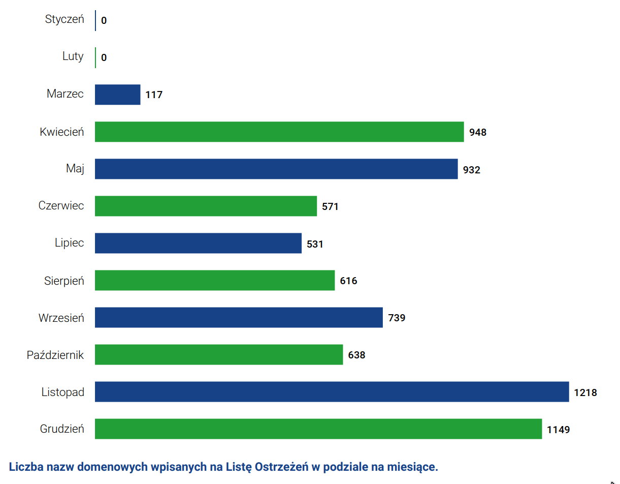 W momencie kiedy piszę ten artykuł, na liście jest 34 122 domen. W 2020 roku na listę ostrzeżeń CERT trafiło blisko 7500 domen (Rysunek 2).