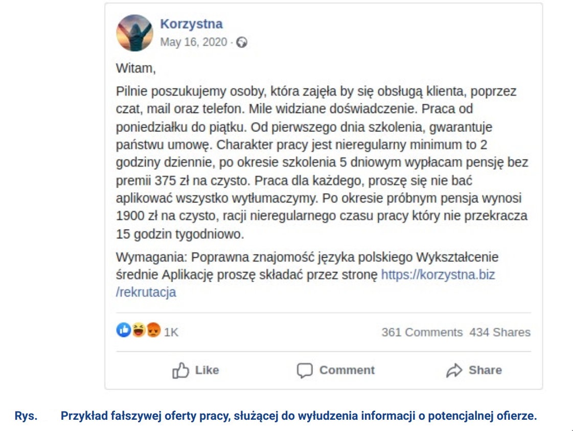 W social media pojawiają się również posty, które przekierowują na przestępcze witryny wyłudzające dane. Rysunek 6 pokazuje fałszywą ofertę pracy, która kieruje ofiary na stronę w domenie z rozszerzeniem .biz w celu wyłudzenia danych osobowych, które następnie można użyć np. do wyłudzenia kredytu na dane ofiary.