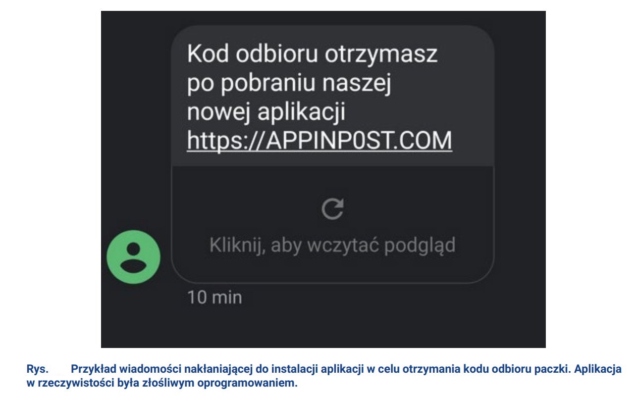 Rysunek 7 pokazuje SMS, który wykorzystuje domenę z rozszerzeniem .org („dpdoplata”), w celu przekierowania na stronę wyłudzającą dane do konta bankowego. Na Rysunku 8 widać wiadomość przekierowującą do witryny wykorzystującą domenę z rozszerzeniem .com („appinpost”) która podszywa się pod firmę kurierską i ma nakłonić do instalacji złośliwej aplikacji na smartfonie.