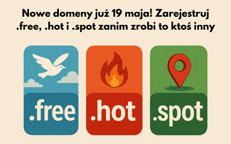 Lubisz być pierwszy? W poniedziałek 19 maja 2025 startuje rejestracja trzech nowych rozszerzeń domen: .free, .hot i .spot. Każda z nich to zupełnie inna historia – i ogromna szansa, by wyróżnić się w sieci. Jeśli myślisz o nowym projekcie, budujesz markę, prowadzisz kampanię lub chcesz po prostu przyciągać uwagę – to coś dla Ciebie.