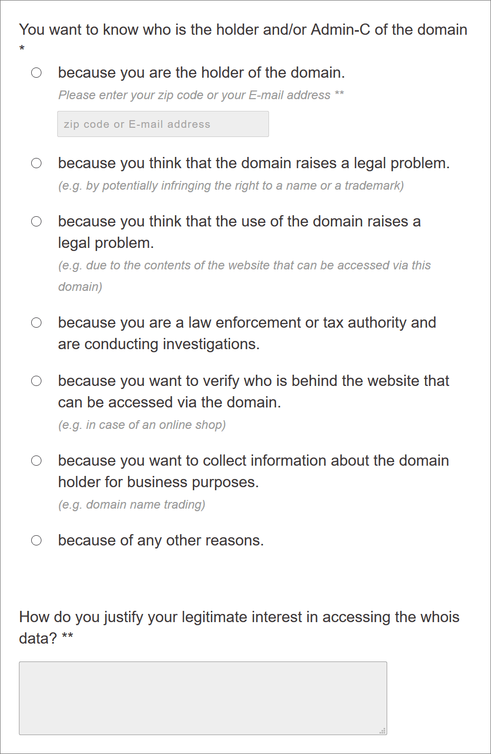 DENIC wprowadził ograniczenia dostępu do bazy WHOIS. Obecnie, aby wyświetlić dane abonenta, trzeba zadeklarować cel, dla których potrzebujemy do nich dostępu.