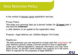 Wprowadzona zostaje również zasada usuwania danych, które nie są już w użyciu. EURid, jako rejestr działający na podstawie prawa belgijskiego, zgodnie z tym prawem ma obowiązek przechowywania danych przez okres 10 lat. Oznacza to, że nasze dane będą przetwarzane przez okres 10 lat nawet po ustaniu umowy utrzymania nazwy domeny z końcówką .eu.