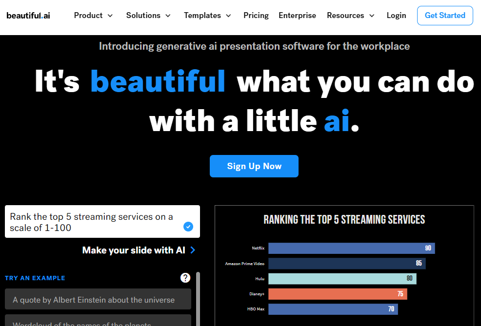Beautiful.ai- to strona automatycznie generująca prezentacje, po wprowadzeniu tekstu. Narzędzie oferuje inteligentne funkcje AI, takie jak automatyczne projektowanie układu, inteligentna zmiana rozmiaru, sugestie treści, a nawet analiza danych.
