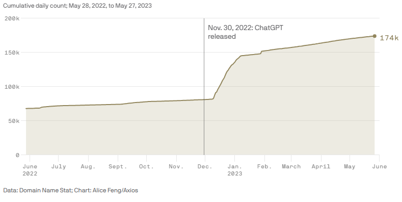 Ze strony axios.com dowiadujemy się, że “liczba rejestracji nazw domen .ai wzrosła w ciągu ostatniego roku o 156%, w porównaniu do zaledwie 27% wzrostu rejestracji domen .com w tym samym okresie, zgodnie z danymi”. Dane odnoszą się do okresów od 28 maja 2022 do 27 maja 2023 roku.