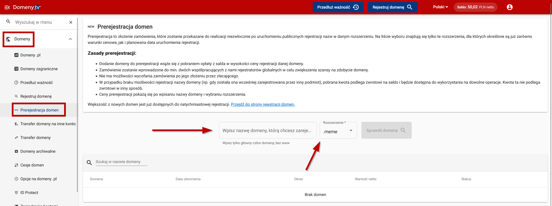 Zgłoszenie domen .ing i .meme jest możliwe w panelu administracyjnym w zakładce Domeny > Prerejestracja domen. Pamiętaj, że dodanie domeny do prerejestracji wiąże się z pobraniem opłaty z salda w wysokości ceny rejestracji danej domeny. Zasil wcześniej saldo prepaid odpowiednią ilością środków. Instrukcję zasilenia konta znajdziesz na naszej stronie.