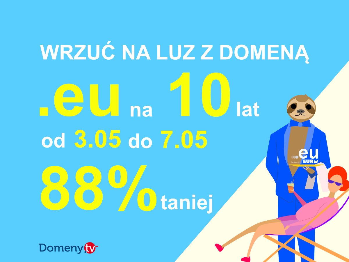 Powraca nasza słynna promocja na domenę . eu! Od 3 maja 2021 roku do 7 maja 2021 roku zarejestrujesz wybrane nazwy w domenie .eu o 88% taniej niż zwykle! Sprawdź szczegóły.