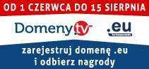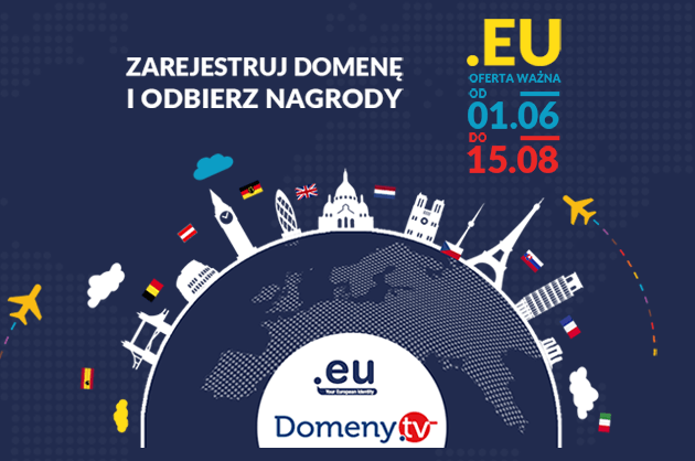 Zapraszamy do wzięcia udziału w naszej najnowszej promocji, w ramach której rozdajemy nagrody za zarejestrowanie domeny .eu. Na chwilę obecną wystarczy zarejestrować w Domeny.tv jedną domenę .eu w okresie promocji - od 1 czerwca do 15 sierpnia oraz zgłosić się do konkursu.