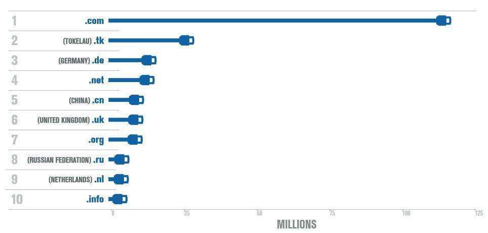 Największą końcówką nadal pozostaje .com, ale dynamicznie rozwijają się domeny narodowe takie jak .tk (Tokelau) - 2. miejsce, .de (Niemcy) - 3. miejsce, czy też rozszerzenie krajowe Chin .cn - 5. miejsce.