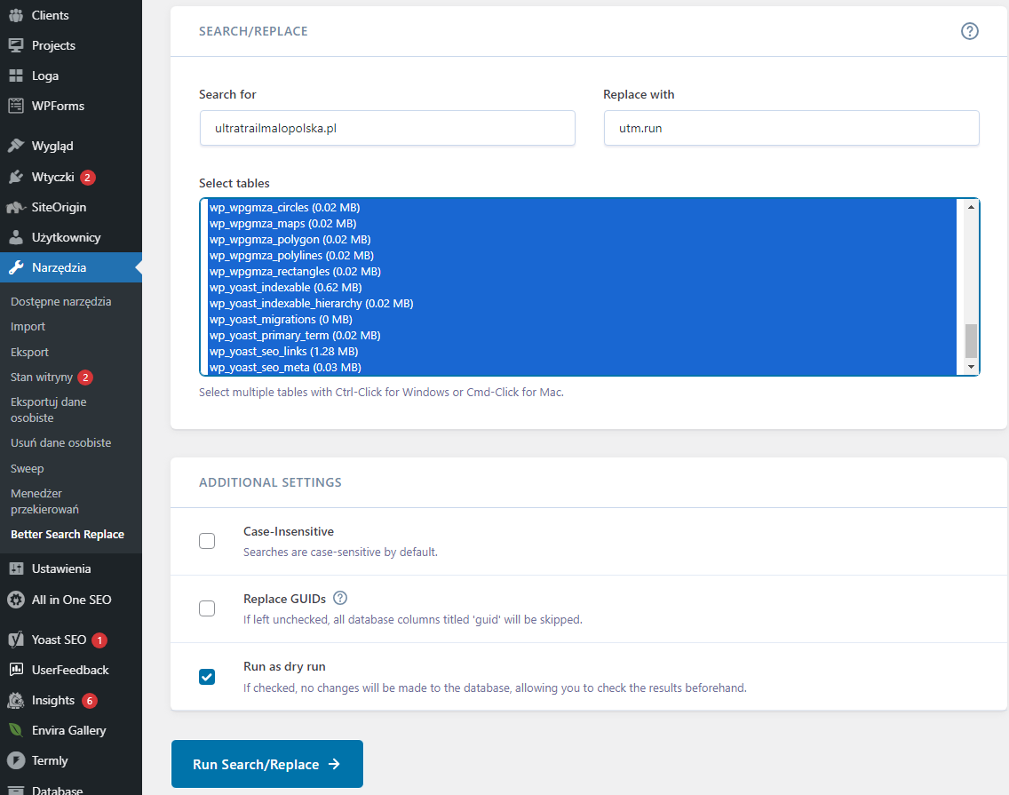 Przejdź do zakładki “Narzędzia” i kliknij “Better Search Replace”. Kolejno w pole “Search for” wpisz stary adres URL strony, a w “Replace with” nowy. Zaznacz wszystkie tabelki, odznacz “Rus as dry run” i uruchom wtyczkę.