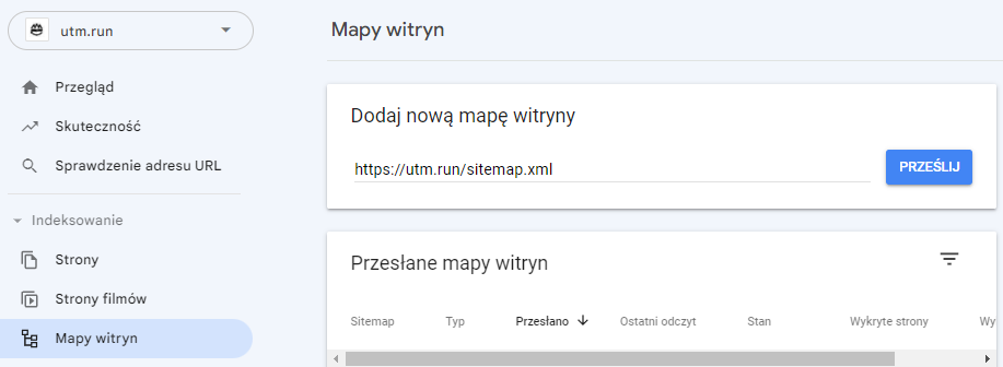 Status utworzonej mapy sprawdzisz dopisując “/sitemap.xml” po swojej domenie w pasku wyszukiwania, np “https://utm.run/sitemap.xml”. Następnie prześlij mapę w Google Search Console - podobnie jak na załączonym zrzucie ekranu.