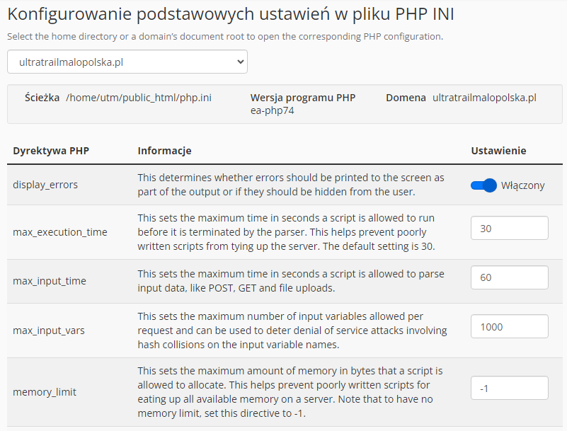 W przypadku zmiany linkowania domeny ultratrailmaloposka.pl natknęliśmy się na błąd: “An error occurred processing your request. Try decreasing the "Max Page Size", or contact support.”. Pojawił się on przy zmianie danych w dwóch najbardziej obszernych tabelach - “wp_postmeta” i “wp_posts” i dotyczył limitu pamięci PHP, który określa maksymalną ilość pamięci, z której może korzystać dowolny skrypt PHP uruchomiony na koncie klienta. Jeśli u Ciebie również pojawi się taki problem, to rozwiązaniem jest zwiększenie tego limitu. W tym celu zaloguj się do konta cPanel i przejdź do zakładki “Edytor MultiPHP INI”. W polu “memory_limit” zwiększ wartość. W naszym przypadku pierwotną wartością było 128M i zwiększyliśmy ją tymczasowo na “-1”. Uruchomiliśmy bezkonfliktowo Better Search Replace i ponownie zmieniliśmy limit - tym razem na “256M”.